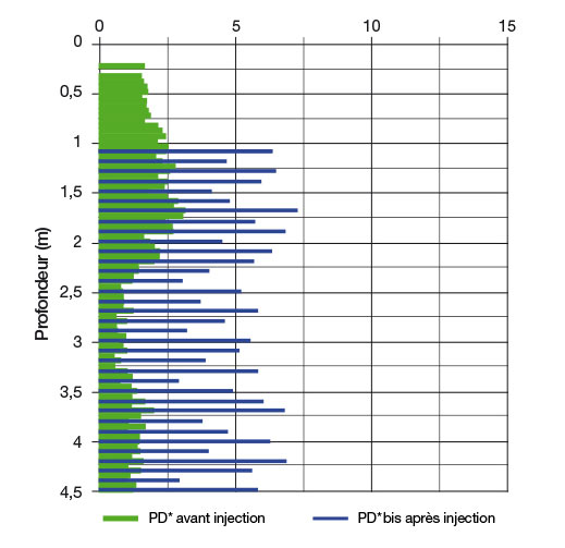 Le but de la solution SOIL COMPACTING®, est d’augmenter la portance du sol par une densification du sol et neutralisation des zones de contrainte insuffisante. Nous réalisons des tests de portance du sol et notamment des sondages au pénétromètre dynamique à la fin des travaux d’injection dans la zone traitée. Les opérations d’injection s’arrêtent quand les portances requises sont obtenues indépendamment de tout mouvement du sol et de la structure.